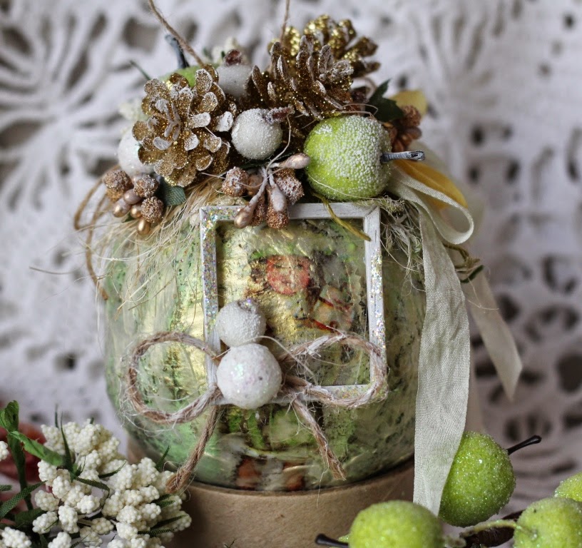 Первое - сам шар у меня из папье маше (ручная работа с нулевого этапа), мы эти шарики всей семьёй два года назад делали, теперь уже и забыла, какой была идея...помню только,что высохнуть они не успели к нужному времени... так и остались без дела "валяться". Зато трудились мы над ними долго... всё как положено - клейстер, газета, воздушные шарики в основе для придания формы, сушка на верёвке...